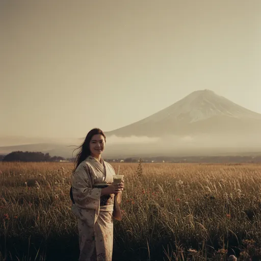 25-year-old Japanese woman with a curvaceous figure, standing in a meadow before Mount Fuji, gentle breeze lifting her hair, relaxed stance, one hand holding an iced matcha latte, the other resting on her kimono; graceful posture, soft gaze toward camera, serene, warm eyes, gentle closed-lip smil...; relaxed stance, one hand holding an iced matcha latte, the other resting on her kimono; graceful posture, soft gaze toward camera; open meadow at base of Mount Fuji, golden hour, tall wild grasses, scattered wildflowers, morning mist on slopes, atmospheric haze creating depth layers, soft golden backlight, gentle rim light on ...; quiet nostalgia, contemplative, poetic, Wong Kar-wai stillness; cinematic arthouse film still, lo-fi analog film — lifted blacks, desaturated muted tones, warm amber-sepia cast, flat contrast, hazy softness, visibl; long shot, subject small in frame occupying lower third, generous negative space above, rule of thirds, subject off-center left, Mount Fuji anchoring the right, vintage 50mm anamorphic, subtle flare,; soft golden backlight, gentle rim light on hair, blooming highlights, no harsh shadows