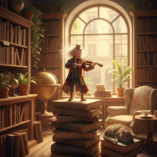 a diminutive street musician, no taller than a wine bottle, performing atop a stack of vintage leather-bound books in a cozy Parisian bookshop.; a diminutive street musician, no taller than a wine bottle, performing atop a stack of vintage leather-bound books in a cozy Parisian bookshop.; The tiny violinist wears a patchwork coat of jewel-toned velvet scraps and miniature brass buttons, their wild silver hair crowned with a thimble-size; Golden afternoon light streams through dust motes, in the warm, honey-colored atmosphere.