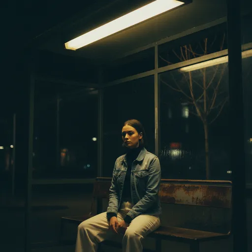 “A young woman with a contemplative expression, seated casually at an old metal bus stop at night.; She wears a faded denim jacket over a dark turtleneck and loose cream trousers., Medium portrait framing, calm but cold mood.”; The rest of the scene fades into darkness with subtle retro grain.; A single dull yellow tube light overhead casts harsh, uneven illumination.