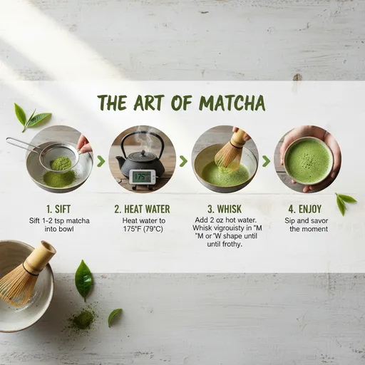 Infographic that shows how to make Matcha; photorealistic, high detail; natural lighting