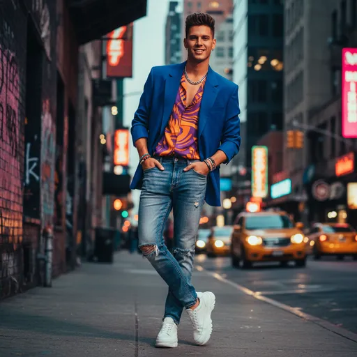 An ultra-realistic full-body cinematic fashion portrait of a stylish young man.; Standing confidently, One leg crossed over the other, Both hands in pockets, Relaxed, confident; Bold, vibrant, high-fashion street style, Modern fashion photography; Ultra-realistic, high detail, Modern fashion photography, Bright, sharp, vivid tones with bold contrast, Highly detailed textures, Strong edge clarity; Bright cinematic lighting, Sharp color contrast, Crisp highlights and shadows, Vivid, modern fashion-photography mood