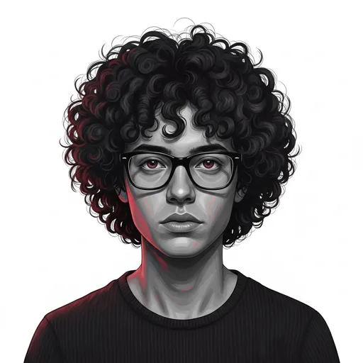 and purples, which appear as if painted or projected onto the face, neck, and shoulders., The eyes have a reddish-brown hue., uploaded face as reference; The subject features voluminous, dark, curly hair with defined strands and a stylishly messy texture.; A highly detailed 8k digital illustration of a person, presented as a close-up, eye-level headshot, facing directly forward against a clean white background., The composition is centered, capturing th; They wear distinct black-framed glasses.The overall aesthetic combines a grayscale base for the skin and a dark, ribbed t-shirt with dynamic, vibrant splashes of multi-colored light, including reds, o