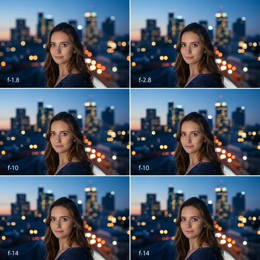 Beautiful woman as model, comparison of f/1.8, f/2.8, f/10, f/14 aperture effects; posing gracefully; city blue hour after sunset; serene, elegant, soft; photorealistic, high detail, 85mm prime lens; four-panel comparison showing depth of field changes; natural twilight lighting, blue-hour ambient glow
