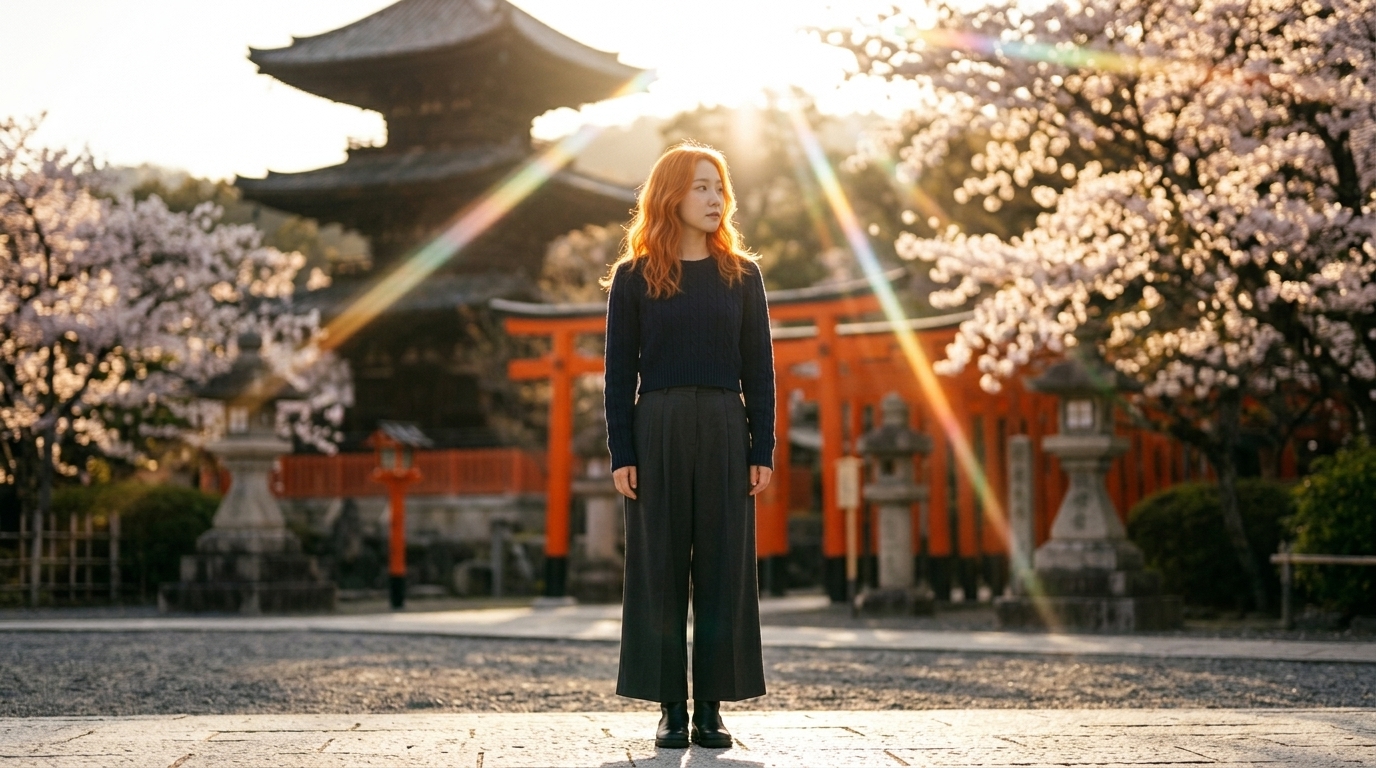 BACK LIT WITH FLARE — sun directly behind the subject's head creates a brilliant rim light on the subject's hair and dramatic anamorphic lens flares streaking across the frame. Cherry blossoms glow in the backlight. Dreamy ethereal mood.