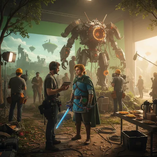 Backstage photo of the 《 Legend of Zelda: Breath of the Wild 》 movie; photorealistic, high detail; natural lighting