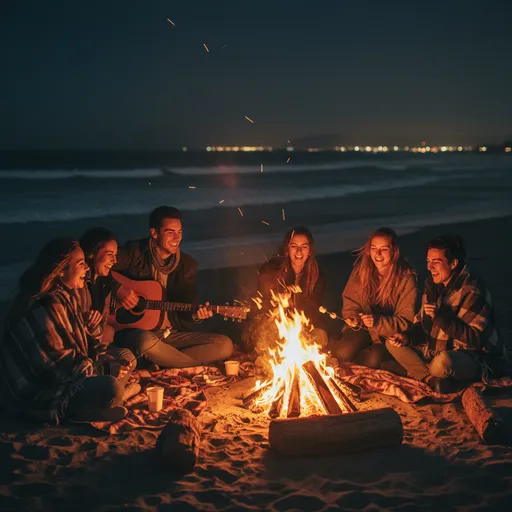 Beach Bonfire in California; Beach Bonfire in California, The firelight illuminates their faces while the ocean is dark in the background; A low-light digital picture captures a group of friends laughing around a bonfire on a sandy beach at night.