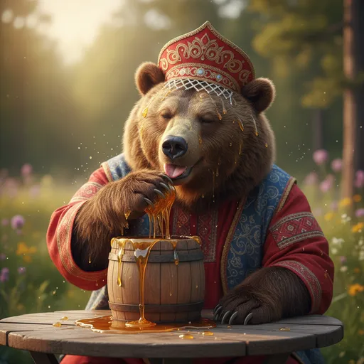 The bear dips its paw slowly into an old wooden honey barrel, lifting it up with thick golden honey dripping in glistening streams.; A large brown bear dressed in intricate traditional Russian folk clothing, sitting at a rustic wooden table outdoors.; The bear joyfully licks its paw, with soft focus on the natural background to enhance the warm, inviting atmosphere, rendered in ultra-realistic detai; The scene is captured in close-up cinematic style, highlighting the rich texture of the honey shining in warm, golden sunlight.