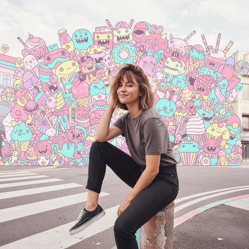 beautiful young woman (early 20s), sitting sideways on a concrete street barrier, one knee up, one arm resting on it, giving a winking smile, cute, confident, playful, light brown, messy shoulder-length bob with wispy bangs, fair with warm undertones, entire background packed with overlapping swe...; sitting sideways on a concrete street barrier, one knee up, one arm resting on it, giving a winking smile; urban street corner, painted curb, faded crosswalk lines, distant buildings, cloudy-bright sky; soft, pastel, airy, cute, overloaded, vibrant, surreal; messy shoulder-length bob with wispy bangs, dense maximalist sweets-monster pop-art cluster, flat neon colors (pink, cyan, lime, yellow, purple) with; mid to low angle, wide lens with mild depth warp, subject centered with plenty of room for decoration layers; bright diffused afternoon light, soft, pastel, airy