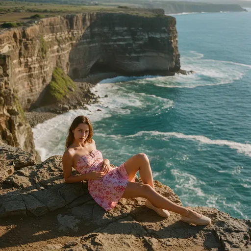 A beautiful young woman reclining naturally on a rocky cliff edge overlooking turquoise ocean waves., female, young adult, strapless pink floral mini dress, beige flat espadrilles; relaxed, natural reclining pose with correct limb orientation; dramatic coastal cliffs, rocky cliff edge, turquoise ocean waves crashing below, bright natural sunlight, cinematic lighting, photorealistic; high detail, shot on 35mm film; high detail, shot on 35mm film, 1:1; bright natural sunlight, cinematic lighting, photorealistic