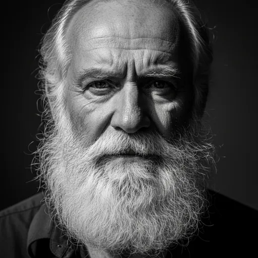 Black and white portrait of an elderly bearded man, full face, deep set eyes, fine wrinkles, strong natural light from a side, high resolution, very realistic photo-style; photorealistic, high detail; natural lighting