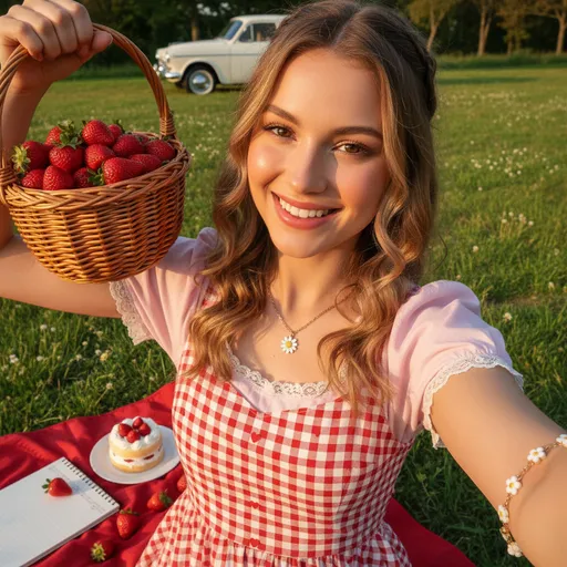 bright outdoor selfie, red and white checkered dress with small heart patterns, light pink short-sleeve shirt with lace trim, gold daisy necklace, gold bracelet with white floral charms; selfie, arm extended toward the camera, close-up upper body, centered face, holding a wicker basket filled with strawberries; picnic outdoors during golden hour, green grass field, white wildflowers, red picnic blanket, small strawberry cake, notebook on the blanket, parked car in the background, warm golden sunlight crea...; cute, summery, soft and warm, warm golden tones, pinks, reds, creamy whites, natural greens, playful, sweet, cozy picnic moment; soft waves with small braids, cute, summery, soft and warm; selfie, arm extended toward the camera, close-up upper body, centered face; warm golden sunlight creating soft highlights and glowy skin tones