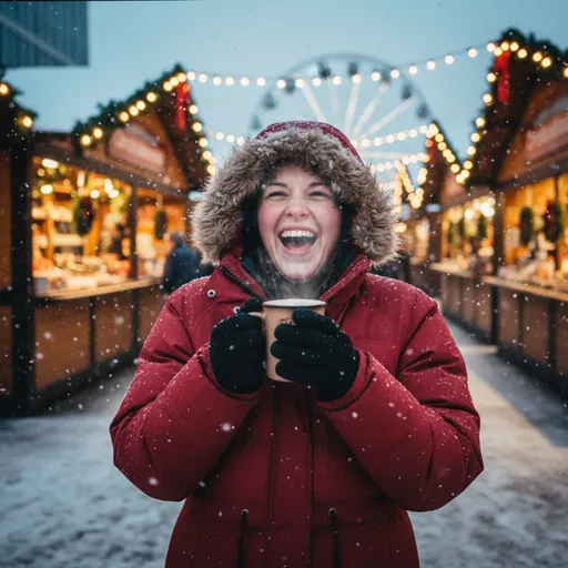 Christmas Market in Chicago; A low-resolution digital picture focuses on a woman in a thick winter coat holding a mug of hot cocoa, laughing.; Festive lights and blurred market stalls with holiday decorations fill the background under a light snowfall.