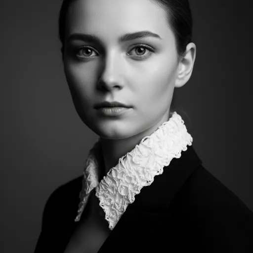 A cinematic, ultra-realistic monochrome portrait of a young woman with expressive eyes and a calm, intense gaze., female, black attire with a white textured collar creating strong contrast; smooth monochrome gradient, minimalist, draws focus to the face; minimalist, artistic, elegant, high texture detail, crisp monochrome rendering, premium realism; soft but high-contrast monochrome lighting, ultra-realistic, high-resolution, fine tonal range; close-up portrait, ultra-realistic, high-resolution, fine tonal range, sharp on eyes and facial details, smooth background gradient; soft but high-contrast monochrome lighting, gentle highlights on facial features, subtle shadow depth, cinematic, clean, refined