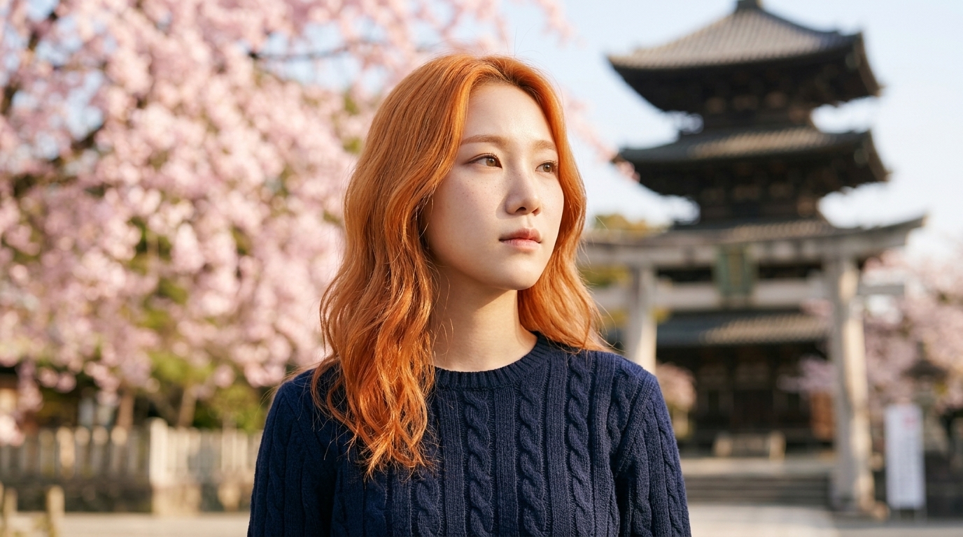 CLOSE-UP — head and shoulders only, the subject's face fills most of the frame. Looking thoughtfully off to the side. Soft pink cherry blossom bokeh fills the background.