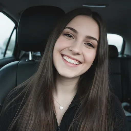 A close-up selfie portrait of a young woman smiling brightly, seated inside a vehicle. The setting is the front seat of a car, indicated by the black leather headrest and seat visible behind her. The lighting is soft and natural, suggesting daytime, likely entering through the car windows.; Seated, head tilted slightly to the right, facing camera, Worn on body, Falling straight down, Upright, Hanging around neck; A close-up selfie portrait of a young woman smiling brightly, seated inside a vehicle. The setting is the front seat of a car, indicated by the black leather headrest and seat visible behind her. T...; Bright, clear, cheerful; High, Soft, even illumination; Eye-level / Slightly high angle (Selfie perspective), Close-up / Head and Torso, Moderate (Subject sharp, background slightly softened), The subject's smile and eyes; Natural Daylight (Window), Front/Side (Diffused), Soft, even illumination, Neutral/Cool Daylight