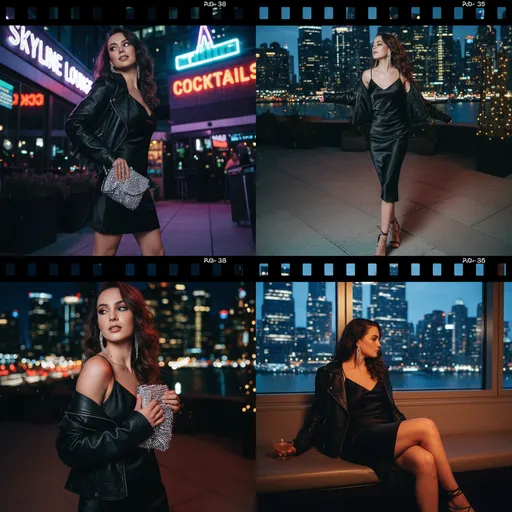 A cohesive 4-panel fashion lifestyle collage featuring the same young woman in a glamorous evening outfit, showcasing cinematic poses under city lights., Young Woman (Consistent character), early 20s, black satin slip dress, leather jacket draped over shoulders, strappy heels, sparkly clutch, ear...; A cohesive 4-panel fashion lifestyle collage featuring the same young woman in a glamorous evening outfit, showcasing cinematic poses under city lights., City at Night / Rooftop Bar, Neon signs, Ci...; Night Luxe, Party Vibe, Cinematic, Edgy; Flash & Neon Mixed, Flash Photography / Film Aesthetic, Night Luxe, Party Vibe, Cinematic, Edgy, 8k resolution, slight grain; Flash & Neon Mixed