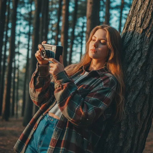 Created with nano banana pro:; long hair hanging sideways, serene dreamy atmosphere but dynamic framing; Cinematic high grain 90s portrait Dutch angle tilted shot, artistic playful moment nature photography, diagonal tree lines background, vintage 90s aes; 23-year-old woman leaning against tree taking picture dynamic composition, wearing oversized flannel shirt layers winter; warm orange cool blue contrast nostalgic grading, heavy film grain texture noise throughout