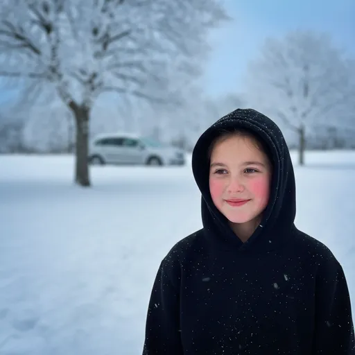 cute, natural, winter outdoor moment, soft depth of field, natural daylight, subtle winter tones, black hooded sweatshirt; outdoors in a winter scene, snow covering the ground, bare trees in the background, blurred silver car behind the girl, clear light blue sky; cute, natural, winter outdoor moment; soft depth of field, natural daylight, subtle winter tones; soft depth of field, natural daylight, subtle winter tones