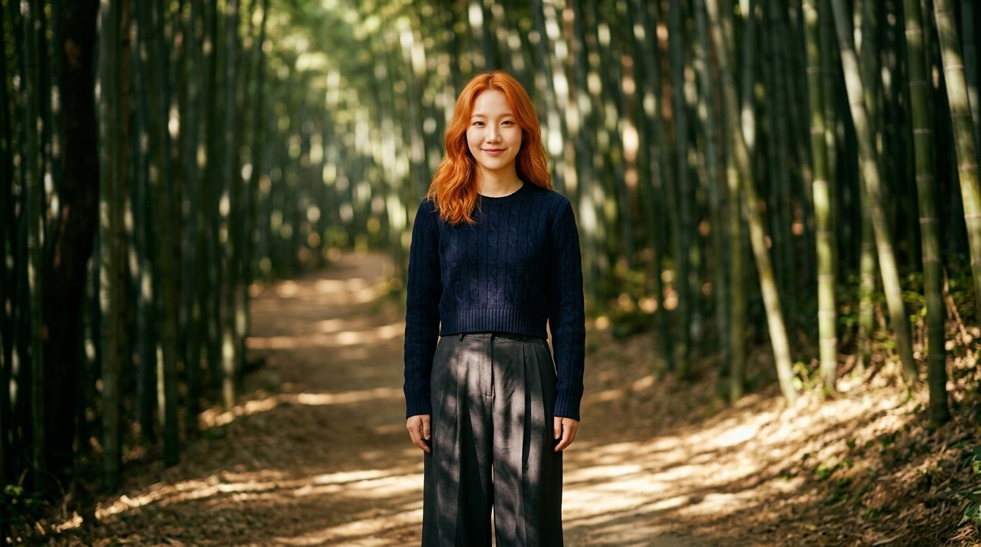 DAPPLED LIGHT — sunlight filtered through dense bamboo leaves above creates a beautiful pattern of bright spots and shadow on the subject's face, body, and the path. Organic patches of warm light scattered across the scene. Natural, magical, mottled illumination. The light pattern is the entire visual signature.