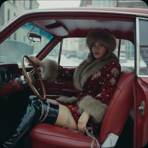 deep red velvet winter outfit with rich texture, long-sleeved with fur trim on collar and cuffs, matching red velvet with ornate jeweled embellishments, luxurious fur hat in matching red tone, black glossy thigh-high wrapped in silver chains; seated confidently in the driver’s seat, angled slightly forward, extended diagonally, one resting on thigh, the other near steering wheel; vintage red luxury car, red leather matching outfit, snowy urban background visible through car windows; regal and composed, editorial winter fashion mood, nostalgic atmosphere, retro photo aesthetic, shot on old analog film camera; editorial winter fashion mood, nostalgic atmosphere, retro photo aesthetic, shot on old analog film camera, vintage grain, muted tones, soft vignette,; cinematic with clear depth planes, medium-full crop, slightly low, --ar 3:4; soft diffused daylight from outside, warm bounce light from red interior, high contrast between warm interior and cold exterior, warm shadows and cool highlights