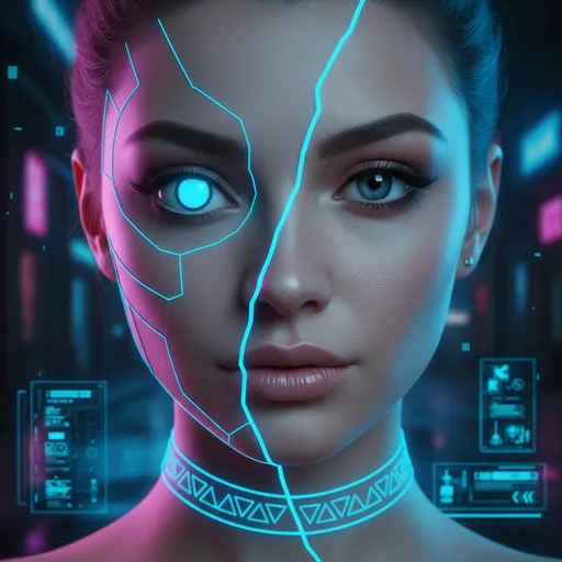 diagonal glitch tear; true, 100% identical to reference, real facial proportions, micro skin texture, true eye shape and tone; thin glowing blue choker, head-and-shoulder portrait, frontal, hyper-realistic + cyber cartoon split; natural glam makeup, true, Straight-on portrait, slight chin lift, soft gaze., true, soft neon mixed lighting, from left pink neon and right blue neon, soft blended neon shadows, dark cyberpunk urban