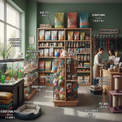 Draw a detailed {{pet shop}} scene and label every object with English words. Label format: - First line: English word - Second line: IPA pronunciation - Third line: {Chinese} translation; photorealistic, high detail; natural lighting