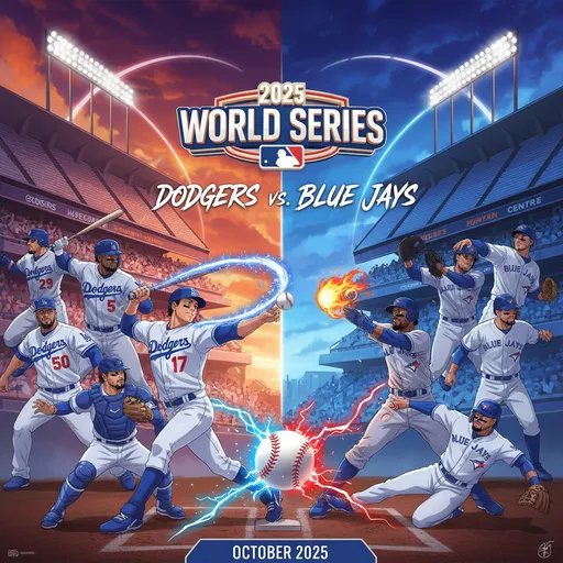 Draw an anime poster for the 2025 World Series: The Dodgers vs., Blue Jays, featuring the starting lineups for both teams., The players' jersey numbers must match real-life.