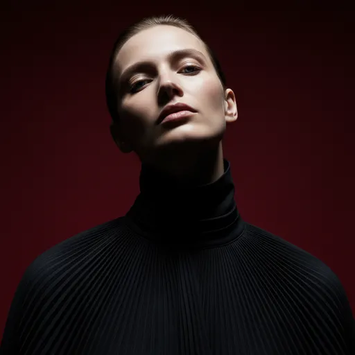 emphasizing bone structure with almost architectural precision., The subject’s expression is unreadable, eyes cool-colored and half-closed, lips relaxed—suggesting nonchalance or quiet defiance.; Editorial tension is created through clo; Captured from a slightly low angle pointing upward, emphasizing the subject’s jawline and neck, the composition exudes calm dominance and sculptural elegance.; hyper-realistic, shot in 1080x1920 format, with cinematic lighting featuring sharp, intense contrast., The background is a deep, rich crimson red, creating a