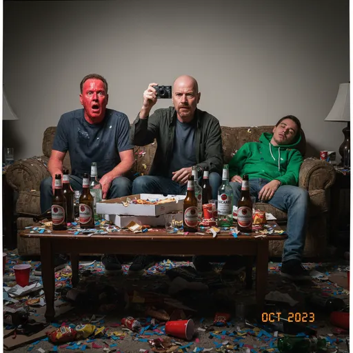 empty beer bottles (Schraderbräu), and pizza boxes., The floor has confetti, wrappers, and a few empty bottles., The Characters & Their Actions on the Couch (Left to Right):; Everything looks naturally messy and unorganized., Hank Schrader: (Sitting on the left end of the couch, awake) His face is bright red and covered in sweat, with an expression of pure shock and disbel; In the center of the scene is a low wooden coffee table completely cluttered with party leftovers: half-full bottles of Bacardi; His face shows intense, determined focus and seriousness, eyes fixed on the air just above Hank's head, completely oblivious to what Hank is reading.,; A disposable camera picture with the classic harsh flash, capturing a messy living room after a chaotic party night., The mood is silly, slightly drunk, chaotic, and humorous.