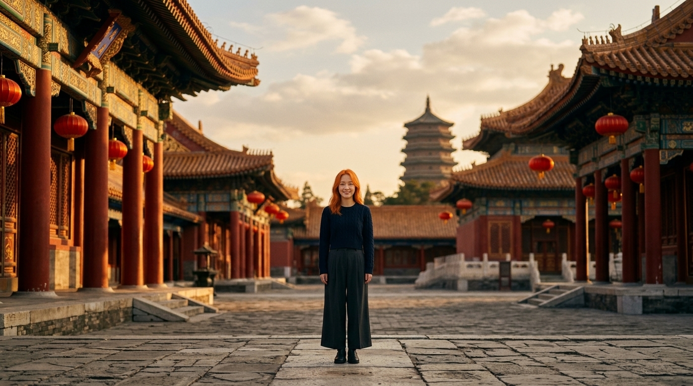 EXTREME WIDE SHOT — the subject is a small figure in the vast Chinese courtyard. Massive pillars and pagoda dominate the frame. The environment is the main subject; the subject provides scale. Epic, cinematic establishing shot.