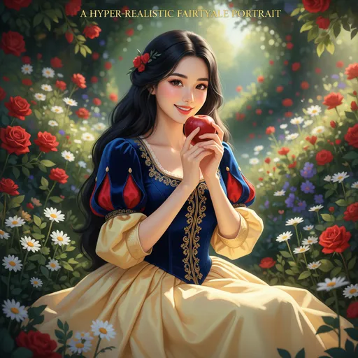 featuring a deep royal-blue velvet bodice with gold embroidery, bright red teardrop sleeve accents, structured puffed sleeves with soft golden cuffs, and a wide, flowing pastel-yellow skirt with gentle natural folds.; She holds a shiny red apple near her lips with a soft, enchanting smile, giving a warm and inviting expression.; Her skin appears smooth, porcelain-like, and naturally radiant, with subtle rosy makeup and expressive dark eyes., Crisp focus on the subject, creamy; "A hyper-realistic 8K fairytale portrait of a young woman dressed in an iconic Snow-White inspired costume, Her long, silky, wavy black hair cascades; She sits gracefully in a lush, magical flower garden filled with blooming red roses, delicate white daisies, and deep green foliage, creating a vibrant fairytale backdrop., Soft diffused sunlight filt