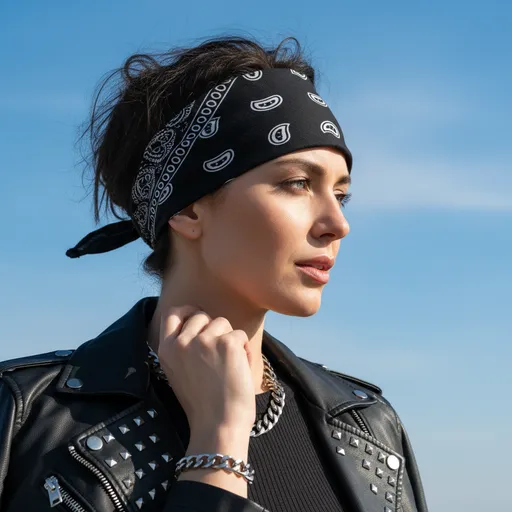 female, close-up, side angle, edgy, modern, mysterious, confident, slightly provocative, calm but intense, black bandana with white swirl patterns; front light highlighting facial features and outfit, bright blue sky; edgy, modern, mysterious, confident, slightly provocative, fair, striking and stylish, modern and edgy; modern, slightly messy, partially covering forehead, striking and stylish, expression and trendy fashion details, modern and edgy, Use this JSON objec; side angle, 3:4; front light highlighting facial features and outfit, bright blue sky