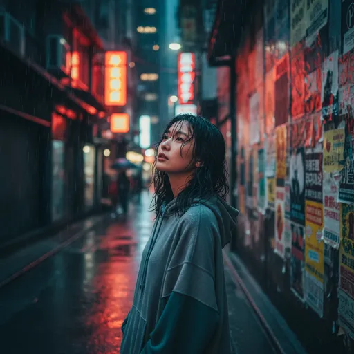 female, dreamy, soft gaze upward, wavy black, slightly damp, oversized slate grey/teal hoodie, oversized slate grey/teal hoodie; light rain / drizzle, Tokyo, Seoul, Hong Kong, poster-covered wall; photorealistic, Tokyo, Seoul, Hong Kong; portrait lens (50mm–85mm), shallow, sharp focus on subject; neon city lighting, high, red neon, yellow neon, cool blue/grey shadows
