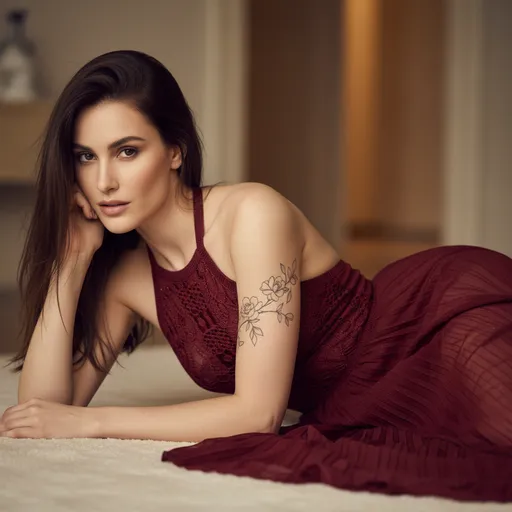 female_model, western, long, straight, wispy, flawless, upper left arm, fine-line floral tattoo, subtle but clear; reclining on the floor, elbow propping her head, intense eye contact, seductive high-fashion, deep wine-red semi-sheer halter dress, intricate knit pa; soft Rembrandt lighting, dimensional facial highlights, 85mm, shallow, hyperrealistic editorial shot, stylized, sof