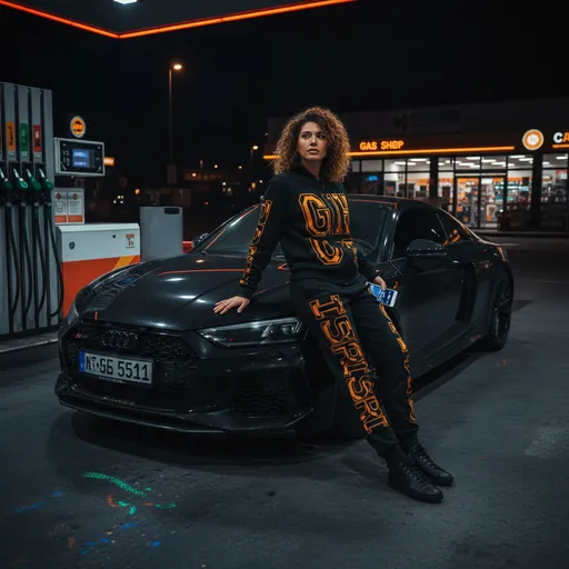 femenino, apoyada contra el luxury sports car RS, chándal, negro, letras distintivas en naranja y amarillo; apoyada contra el luxury sports car RS; estación de servicio, noche, luxury sports car RS negro, suelo mojado reflejando luces urbanas coloridas, elementos de gasolinera, edificio con letreros; oscuro e intenso; ondulado, ultrarealista, 8k, iluminación cinematográfica nocturna, nitidez cinematográfica HDR, texturas hiper detalladas; flagship smartphone, proporciones naturales, texturas realistas, reflejos vibrantes de luces artificiales; reflejos vibrantes de luces urbanas