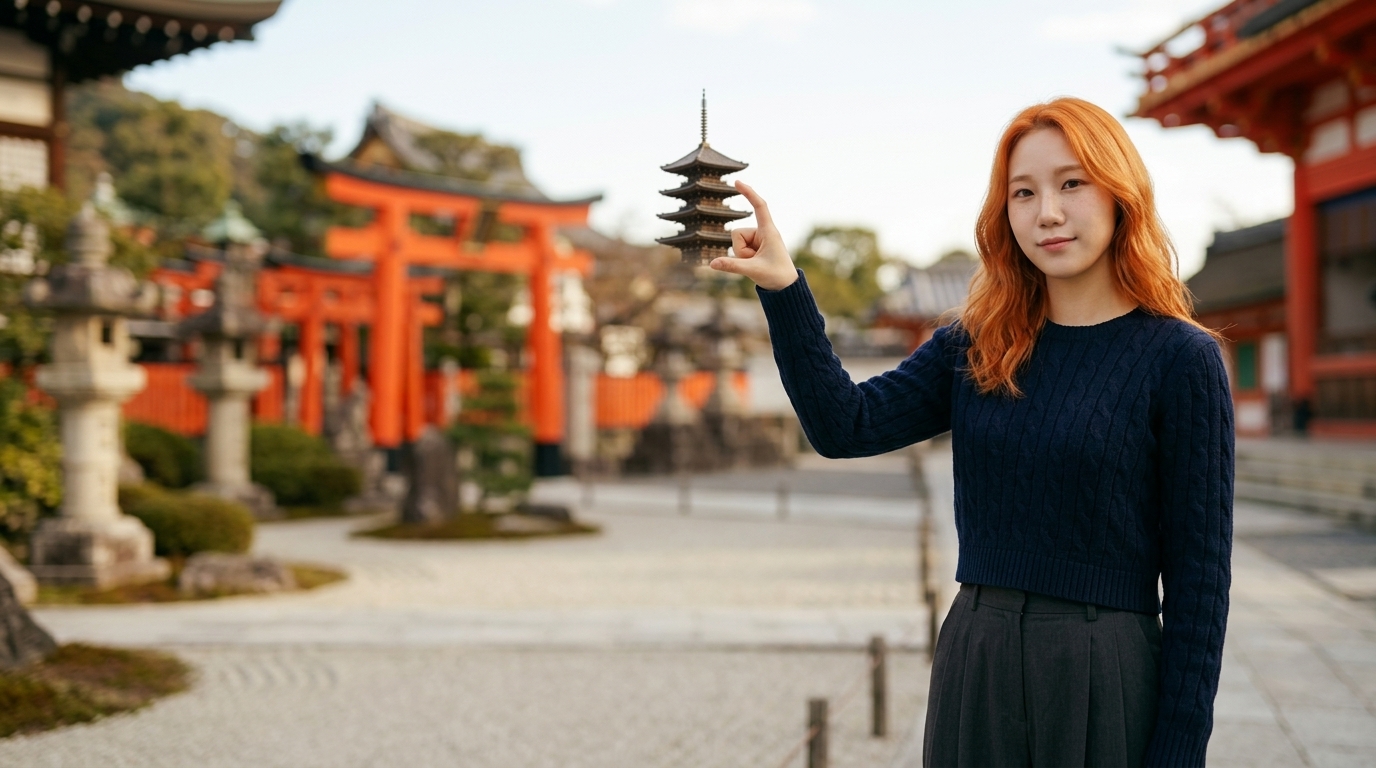 FORCED PERSPECTIVE ILLUSION — the subject stands in the foreground appearing to hold the distant pagoda between the subject thumb and finger. The scale trick makes the giant pagoda look tiny. Classic optical illusion playing with depth perception. Both elements perfectly aligned to sell the trick.