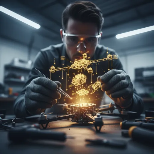 A garage/workshop environment with the subject assembling a complex mechanical device, viewing a 3D exploded assembly diagram floating in space., The person defined by `[UPLOADED IMAGE]`, wearing safety glasses or a work glove, deeply concentrated., Leaning over the bench, holding a small compone...; Leaning over the bench, holding a small component (e.g., a rotor or circuit board) with tweezers or a small screwdriver., Bright, high-contrast yellow/orange vector lines with directional arrows an...; Hovering directly above the disassembled drone parts on the workbench.; Industrial, High Detail, Technical, Action Shot, 16:9, Product/Technical, High Contrast; 16:9, Close-Up, Slightly overhead (designer/technical perspective)., Extremely shallow, focusing only on the hands, the component, and the projected diagram. The background should be a creamy blur (bo; Fluorescent Shop Light and Holographic Glow, Cool, bright, uniform white light from above, contrasted by the warm, directional glow of the yellow/orange hologram.