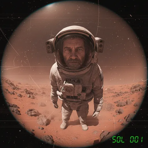 He is wearing a dusty, scuffed futuristic space suit (helmet off)., The lens is covered in red dust particles and scratches., Low-resolution, monochrome transmission artifacts, digital timestamp overlay in the corner "SOL 001".; Raw wide-angle engineering camera footage from the Mars surface., Extreme fisheye lens distortion.; His face is weathered, unshaven, and sun-damaged., Harsh, direct sunlight casts deep black shadows.