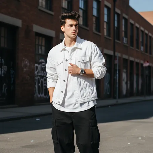 He wars oversized White jacket tshirt & baggy pant,watch; Ultra-realistic 8K photo of a young man with exact facial likeness from the reference image, stylish brown style blak voluminous hair, light skin., h
