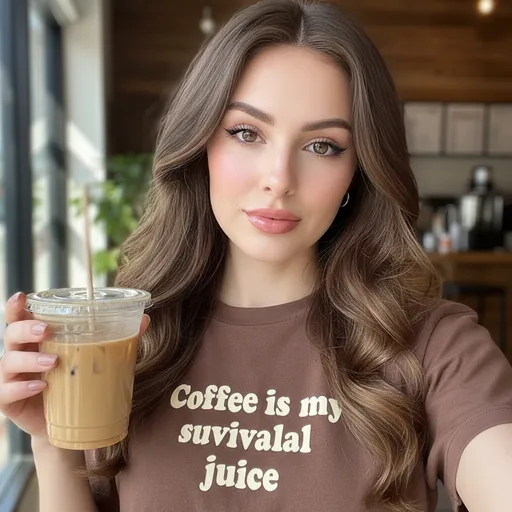 Her eyebrows are well-defined and natural, and her eyes feature delicate eyeliner and long,, feathery lashes., She has a natural, soft pink blush on her cheeks and a glossy pink lip color.; She is holding up a cup of iced latte with straw.; She is wearing a loose brown cropped midriff t-shirt that says "Coffee is my survival juice" in a retro medium sized font.; Her hair is parted down the side, framing her face and flowing over her shoulders.; Create a close-up, eye-level selfie portrait of a young woman with a fair flawless complexion, captivating light brown eyes, and long, cascading wavy brown hair with subtle highlights., The background