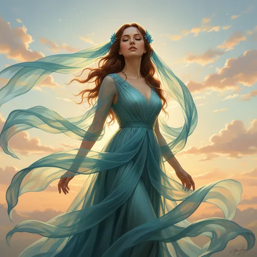 Her long, reddish-brown hair is swept back by the wind., She has a delicate blue floral accessory in her hair near the veil.; She is looking upwards with her eyes closed, with a peaceful, intense expression., The dress fabric is ethereal and sheer, billowing around her.; "A highly detailed portrait of a beautiful woman in a dramatic, flowing teal and turquoise gown and veil, standing outdoors., The background is a bright sky with scattered clouds, giving a golden hour