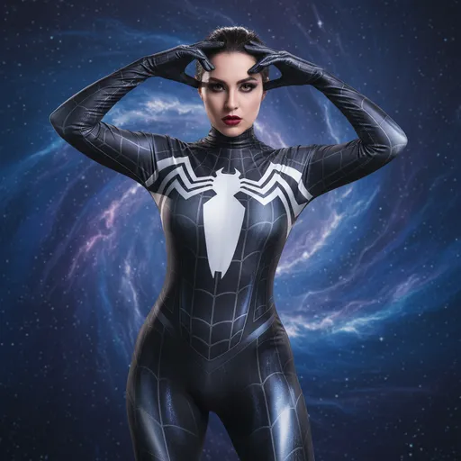 highly detailed full-body portrait of a female cosplayer wearing a cosmic black and silver symbiote suit with a subtle embossed spider-web pattern and a white/silver spider emblem on the chest., {female cosplayer} {superhero/villain inspired} {Spider-Verse symbiote theme}, {full-body black and silver symbiote suit} {embossed spider-web pattern; Her makeup includes dramatic smoky eyes and deep glossy red lips., Her gaze is intense and direct.; The image should be a professional cosplay photograph, hyper-realistic, photorealistic, 8k resolution, with detailed skin and texture rendering.; highly detailed full-body portrait of a female cosplayer wearing a cosmic black and silver symbiote suit with a subtle embossed spider-web pattern and a white/silver spider emblem on the chest., She h; She poses in a dramatic confident stance with both hands raised to cup or touch her head and fingers lightly on hairline., Lighting is soft studio-quality highlighting the glossy texture of the suit a