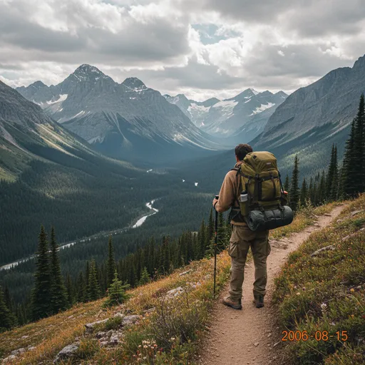 Hiking Trail in the Rockies A slightly blurry digital photo from 2006 shows a hiker with a large backpack pausing on a dirt path, looking out over a mountain range under a cloudy sky; photorealistic, high detail; natural lighting