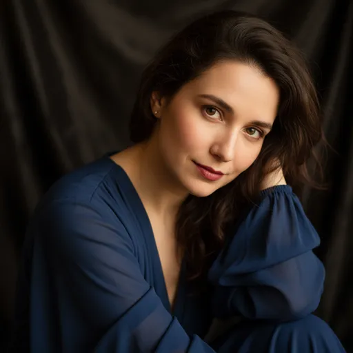 A hyper-realistic, close-up portrait of a woman's face and upper body., A flowy, dark blue dress, Ruffled sleeves; Dark background, Intimate, indoor atmosphere; Intimate, indoor atmosphere; Hyper-realistic, Soft, subtle indoor lighting emphasizing facial details; Soft, subtle indoor lighting emphasizing facial details