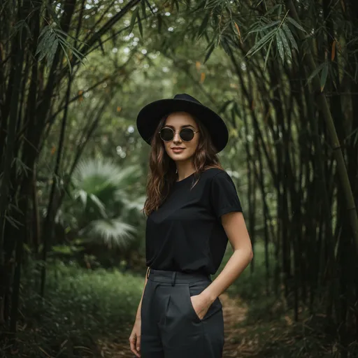 Hyper-realistic environmental portrait of a stylish young woman standing in a dense tropical bamboo forest., Woman, Brown; Hyper-realistic environmental portrait of a stylish young woman standing in a dense tropical bamboo forest.; The background features a deep cinematic depth of field (bokeh) with rich lush greens and tropical undergrowth., Shot on mirrorless camera IV, 35mm lens at f/1.8, high contrast, matte finish, sharp fo; She is wearing a wide-brimmed black fedora hat, round dark sunglasses with thin metal frames, a plain black crew-neck t-shirt tucked in, and dark grey high-waisted trousers., She stands with a confide
