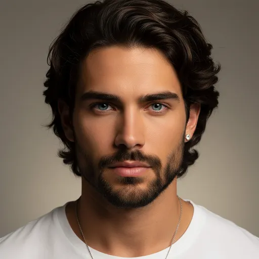 Hyper-realistic portrait of a strikingly handsome young man in his mid-20s, flawless symmetrical face; intense piercing ice-blue eyes, thick dark wavy hair with perfect volume and natural shine, short well-groomed beard; Hyper-realistic portrait of a strikingly handsome young man in his mid-20s, flawless symmetrical face, 8k resolution, photorealistic, masterpiece, bes; sharp jawline, sun-kissed warm skin tone, subtle masculine features, small diamond stud earring in left ear, wearing a simple white t-shirt, thin silver chain necklace, soft studio lighting with gentl