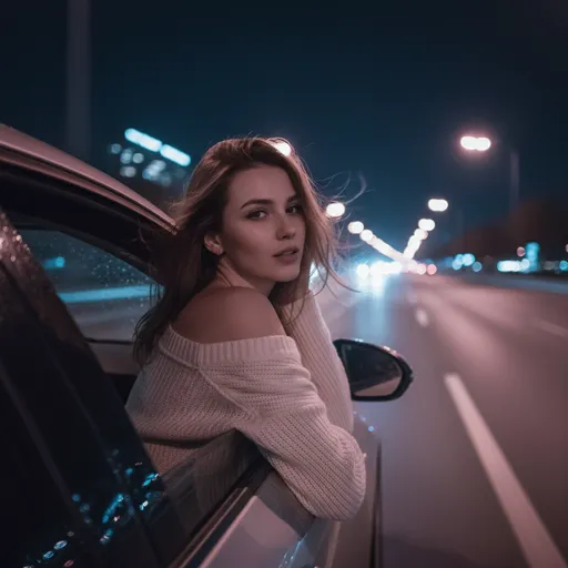 Use the exact face of the uploaded person and preserve their facial features without alteration., Wind moves through their hair as the car travels along a dimly lit road., If the subject is female, dress them in a loose, off-shoulder cream knit sweater that drapes casually down one shoulder, adding; If the subject is male, dress them in a simple cream knit sweater with a clean neckline, fitted enough to look classic and comfortable., The subject is always positioned inside the vehicle, facing the; The overall color palette blends dark blue tones with soft pink accents, creating a dreamy night atmosphere: deep navy sky, desaturated cool hues, gen; Create a cinematic night-drive portrait of the subject leaning slightly out of a moving car window while remaining seated inside the vehicle., and rea; The subject turns their head back toward the camera with a relaxed, intimate, slightly playful expression., Soft streetlights stretch into glowing trails across the background, and the sky is a deep n