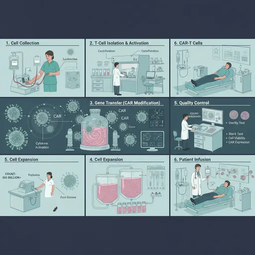 In an illustration describe all of the stages of CAR-T cell therapy from lab to patients; photorealistic, high detail; natural lighting