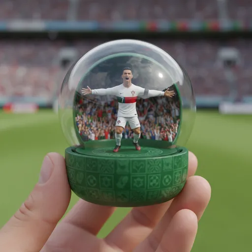 Inside: he’s wearing a crisp Portugal kit, with realistic folds, studs, and cleats., The capsule has a transparent dome and a bold deep-green base decorated with subtle patterns of footballs and Portuguese motifs.; A detailed gashapon capsule diorama held between fingers, featuring Cristiano Ronaldo in his iconic “Siuuu” celebration pose., The background shows a miniature stadium with blurred cheering fans and s