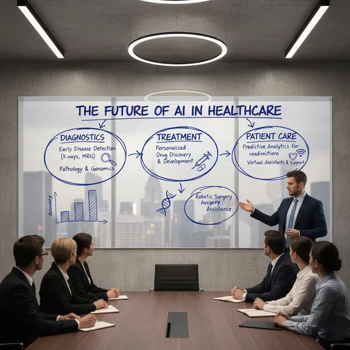 A large wall-mounted glass board is the focal point, covered in deep cobalt-blue marker in natural human handwriting., Topic on the board: THE FUTURE OF AI IN HEALTHCARE, divided into three hand-drawn clusters (DIAGNOSTICS, TREATMENT, PATIENT CARE) with sketched icons, a rough bar chart, and a circu; A presenter stands beside the board, mid-gesture, explaining the content to a group of professionals seated around a sleek conference table, all facing the board and paying close attention.; Glass shows reflections of room lights and attendees, background with windows and city hints, cinematic, premium office lighting, 8K; The blue ink looks convincingly real with darker edges, subtle streaks, glossy reflections, and tiny smudges at stroke ends.; Ultra-realistic scene in a modern corporate conference room, 16:9.; Text and diagrams are clearly handwritten: bold all-caps headings, slightly imperfect; italic subheadings; smaller, neat notes; arrows and icons with slight wobble and pressure variation.